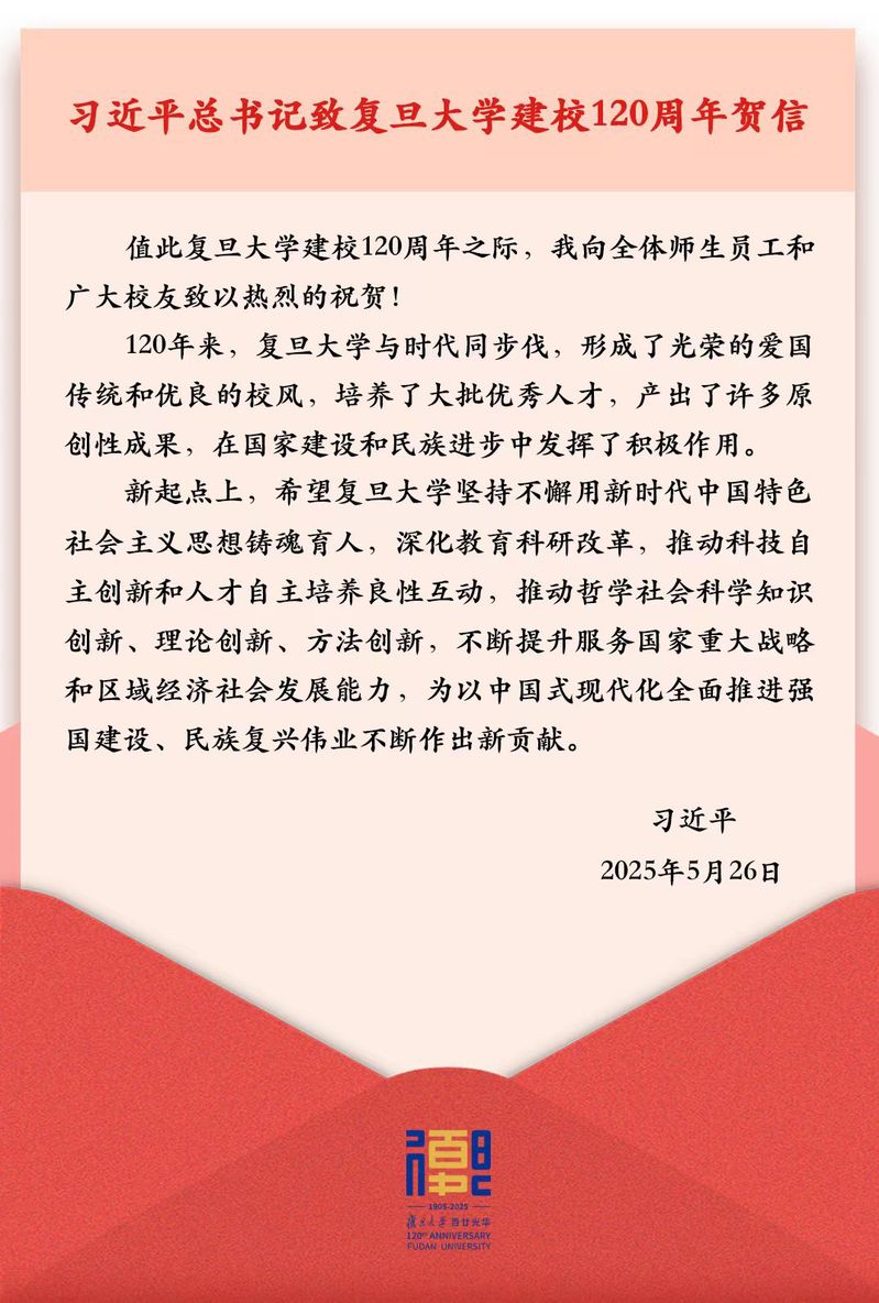 新华社北京5月26日电 中共中央总书记、国家主席、中央军委主席习近平26日致信祝贺复旦大学建校120周年,向全体师生员工和广大校友致以热烈的祝贺。