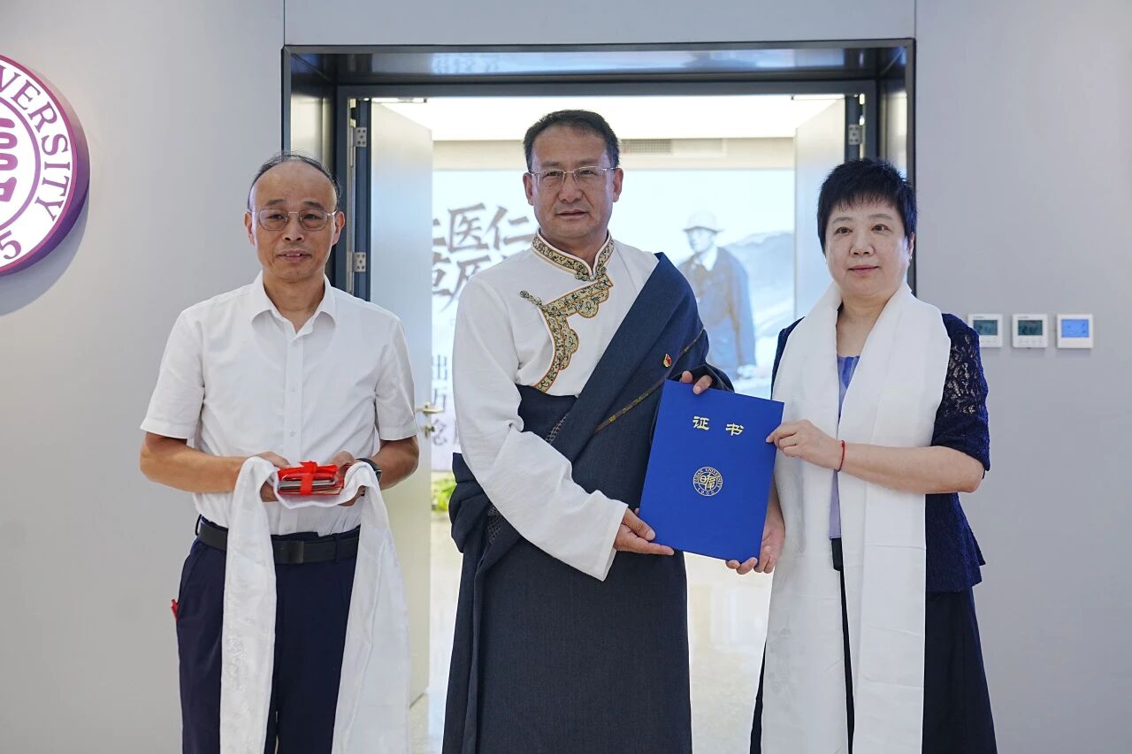 报告会前,“上医仁心 草原曼巴——杰出校友王万青同志纪念展”开展仪式在上医文化中心举行。仪式上,上海医学院副院长吴凡向王团胜颁发捐赠证书,上海医学院党委副书记、纪委书记胡华忠接受捐赠实物。纪念展里一幅幅图片勾勒人生轨迹,一件件实物见证奉献历程,现场观众在观展中提前与榜样对话,汲取奋进力量。